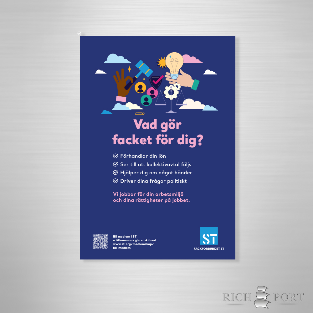 Beskrivning: Den här affischen ger en tydlig och lättöverskådlig bild av fackets roll i arbetslivet. Med konkreta exempel visar den hur facket förhandlar löner, ser till att kollektivavtal följs, stöttar dig när något händer och driver dina frågor – både på arbetsplatsen och politiskt.